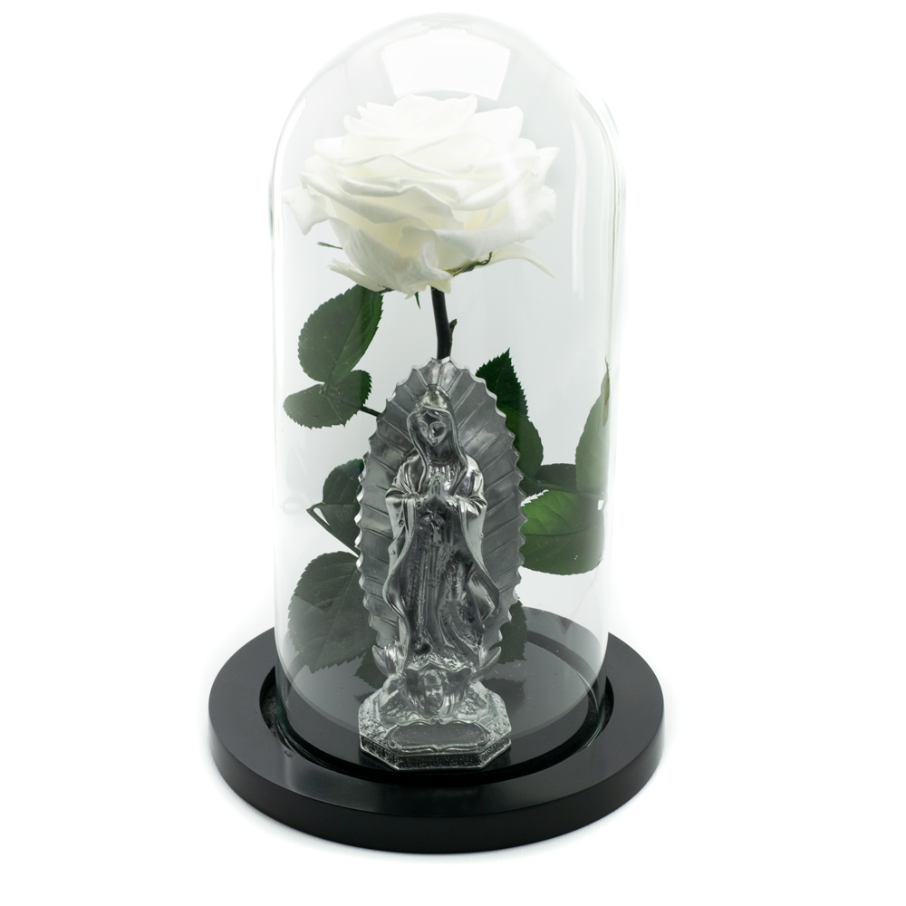 Hermosa rosa encantada preservada con virgen en una urna de cristal incluye tarjeta impresa con mensaje personalizado.